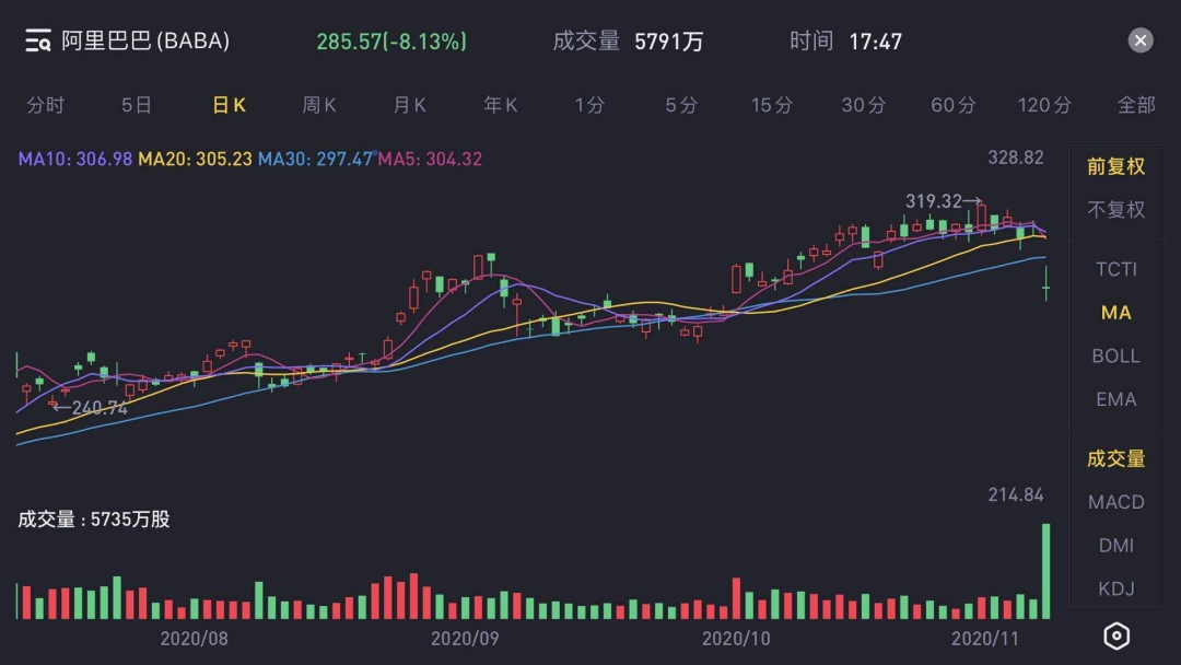 As soon as the news came out, the share price of Alibaba , the largest shareholder of Ant Group, plummeted. As of the close of US stocks on November 4, Beijing time, Alibaba fell 8.13%, from 310 US dollars per share yesterday to 285.57 US dollars per share, and the total market value had evaporated by nearly 70 billion US dollars.