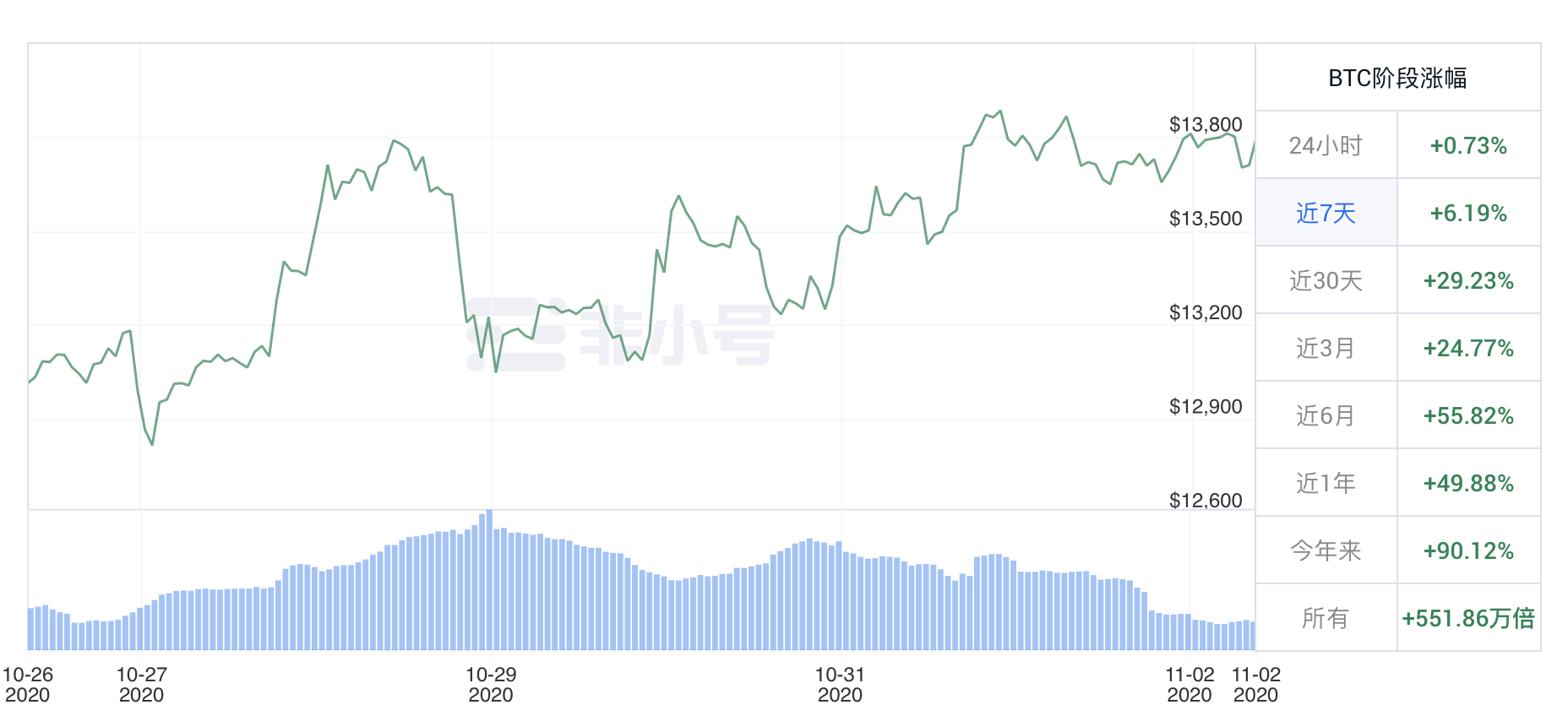 This week, Bitcoin climbed up the ranks, testing the $13,000 and $14,000 mark successively. On October 31, it rose 3.5%, and Bitcoin rushed to a new high of $14,099 after falling in 2018. It has now fallen back to around 13800USDT. Weekly closed up 6%, monthly closed up 28%.