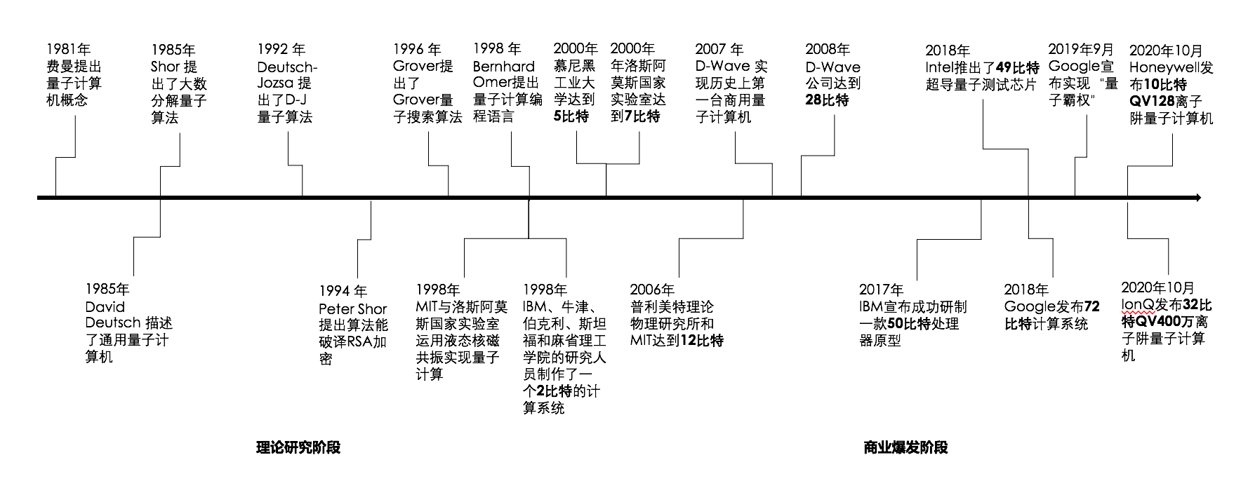 Since Feynman proposed the concept of quantum computer in 1981, quantum computing has entered the stage of theoretical research. However, most of the more milestone progress afterwards are in the direction of quantum algorithms. The Detusch-Jozsa algorithm clearly demonstrated the advantages of quantum computing for the first time, but the algorithm is more scientific than practical. Later, the practical algorithms proposed by people are mainly divided into two categories, namely the prime factor decomposition algorithm and the unordered search algorithm, represented by the Shor algorithm and the Grover algorithm respectively. In 1994, Shor proposed the quantum algorithm for decomposition of large numbers, exponential speeding up the decomposition of large numbers, in 1996 Grover proposed a quantum search algorithm, which accelerated the search of disordered databases by the square root . In 1998, researchers from IBM, Oxford, Berkeley, Stanford, and the Massachusetts Institute of Technology produced a 2-bit computing system.